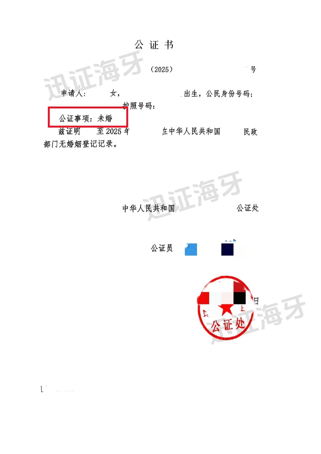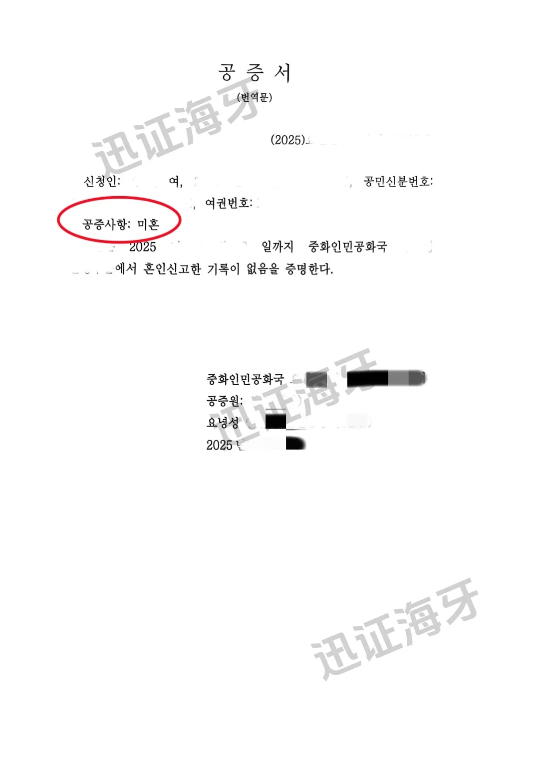 中国未婚公证单身证明提交韩国的办理案例